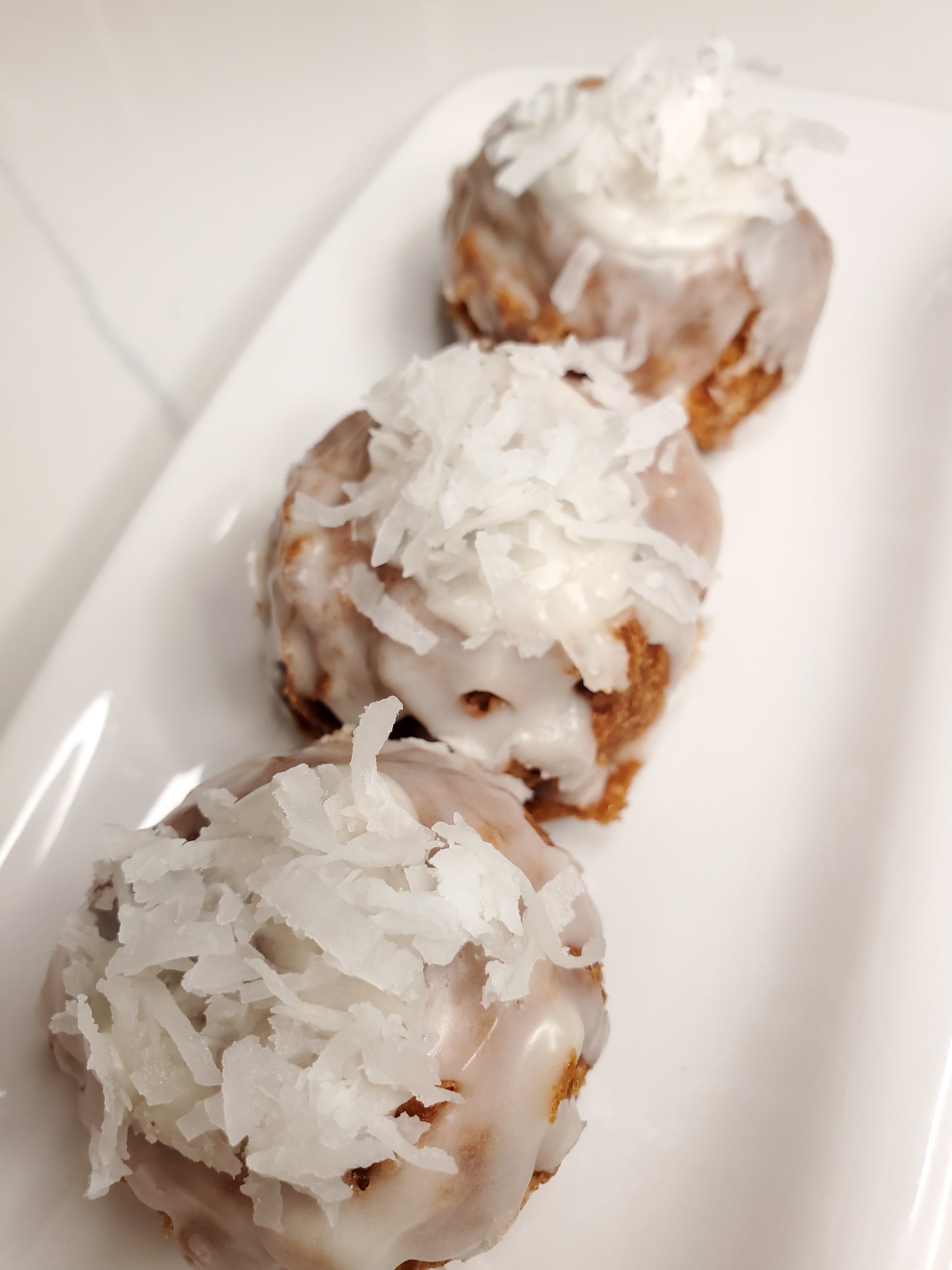 Each Coconut pie ball™ is lightly glazed and topped with sweet shreds of coconut.